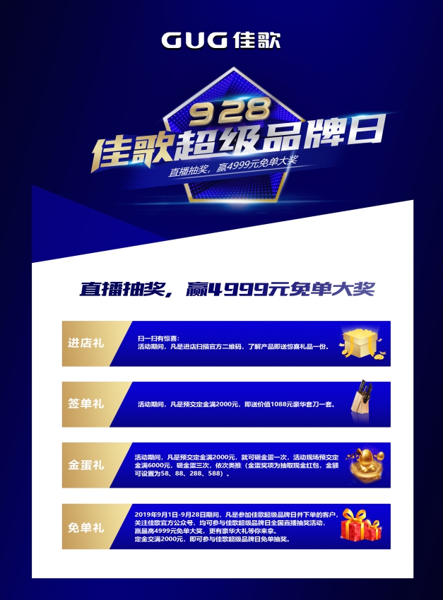 免單禮:201991日至928日期間,凡是參加佳歌超級品牌日并下單的客戶,關(guān)注佳歌官方公眾號,均可參與佳歌超級品牌日全國直播抽獎活動,贏最高4999元免單大獎,更有豪華大禮等你來拿。定金交滿2000元,即可參與超級品牌日免單抽獎。