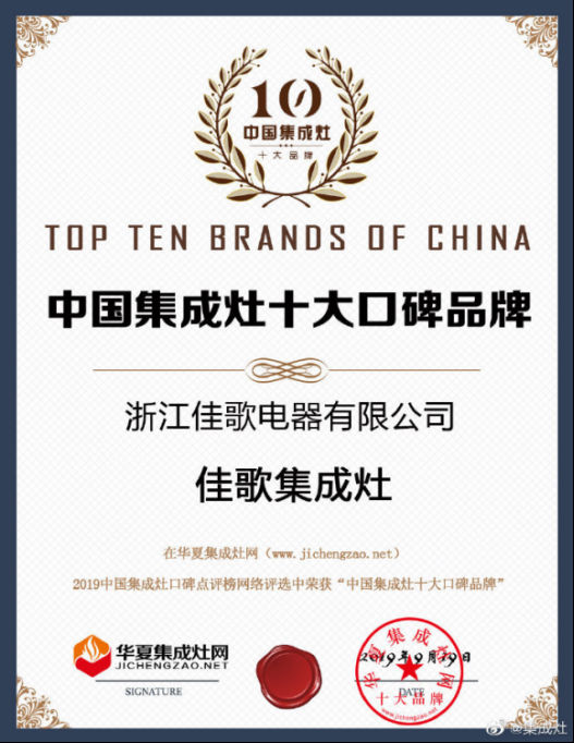 【喜報(bào)】熱烈祝賀佳歌集成灶獲“集成灶十大品牌”“集成灶十大口碑品牌兩項(xiàng)殊榮”
