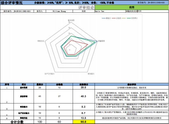 評(píng)審期間,認(rèn)證機(jī)構(gòu)嚴(yán)格進(jìn)行現(xiàn)場(chǎng)審核,從公司基本資質(zhì)、質(zhì)量管理、研發(fā)能力、生產(chǎn)交付、特別關(guān)注的事項(xiàng)進(jìn)行審核。比如特別關(guān)注的事項(xiàng)會(huì)從產(chǎn)品中涉及人身傷害缺陷的管控、合格產(chǎn)品抽查結(jié)果、設(shè)計(jì)知識(shí)產(chǎn)權(quán)、網(wǎng)站店鋪商品等進(jìn)行抽查??傊畯膶徍酥锌梢苑浅H娴牧私獾郊迅杓稍畹母鞣矫婺芰?。