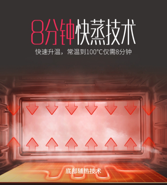 佳歌集成灶蒸箱款擁有65L超大容量,一次滿足8口之家的菜單需求。多種模式可供選擇,快速升溫,常溫100℃只需8分鐘。