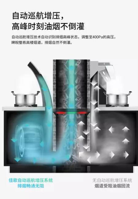 佳歌集成灶采用自動(dòng)巡航增壓科技,通過(guò)檢測(cè)和增壓的實(shí)時(shí)聯(lián)動(dòng),保證自己的煙機(jī)排風(fēng)壓高于公共煙道以及別人的排風(fēng)壓。超過(guò)400pa的排風(fēng)壓遠(yuǎn)高于公共煙道內(nèi)的高峰風(fēng)壓,確保順暢排煙。