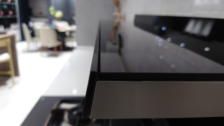 由國(guó)內(nèi)知名設(shè)計(jì)公司洛可可參與設(shè)計(jì)的劉海屏煙機(jī)頭,無(wú)疑是整個(gè)集成灶的C位,槍灰色拉絲紋理的斜面,看上去充滿高級(jí)感。
