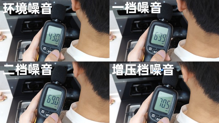 煙機(jī)的噪音表現(xiàn)也十分不錯(cuò),哪怕是最大的增壓檔,分貝值也只在70.5dB(A)附近,符合國(guó)家標(biāo)準(zhǔn)要求。
