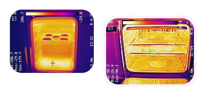 分體蒸烤的效率很高,半小時(shí)不到兩邊都完成了烹飪。打開箱門,通過(guò)熱成像圖可看到烤箱的底部熱管也有參與烹飪,因此腔體溫度非常均勻。